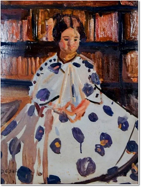 Auguste DESCH (1887-1924) Jeune fille en robe blanche à pois Huile sur carton.