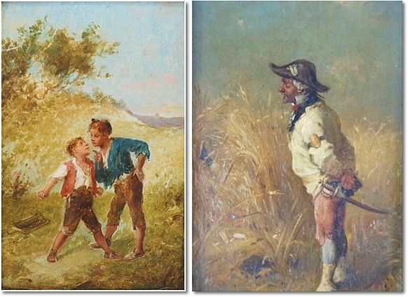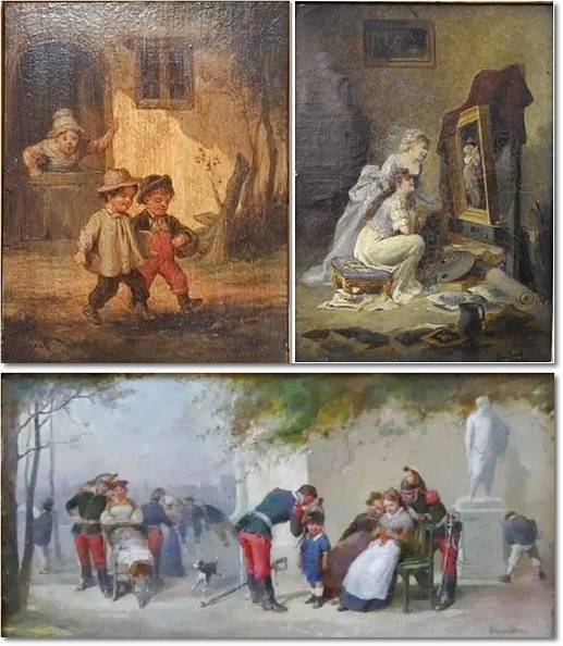 François Louis LANFANT DE METZ (1814-1892) Les enfants terribles Deux huiles sur carton toilés montées sur un même cadre, l' une signée en bas à droite 13,5 x 9 cm et 13,5 x 9 cm 1300 euros le 2/02/25 Orne