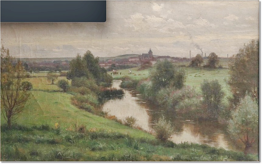 Alfred RENAUDIN . La féculerie Jeanclaude à Lunéville, au pont de Viller. Huile sur toile signée, située "Lunéville" et datée (18)94 en bas à droite. 42 x 50 cm. La féculerie Jeanclaude fut détruite en août 1914 par les Allemands, lors de la Première Guerre mondiale. Toile démontée de son châssis et refixée d'époque sur un carton. Dimension du carton : 45,5 x 54,5 cm.