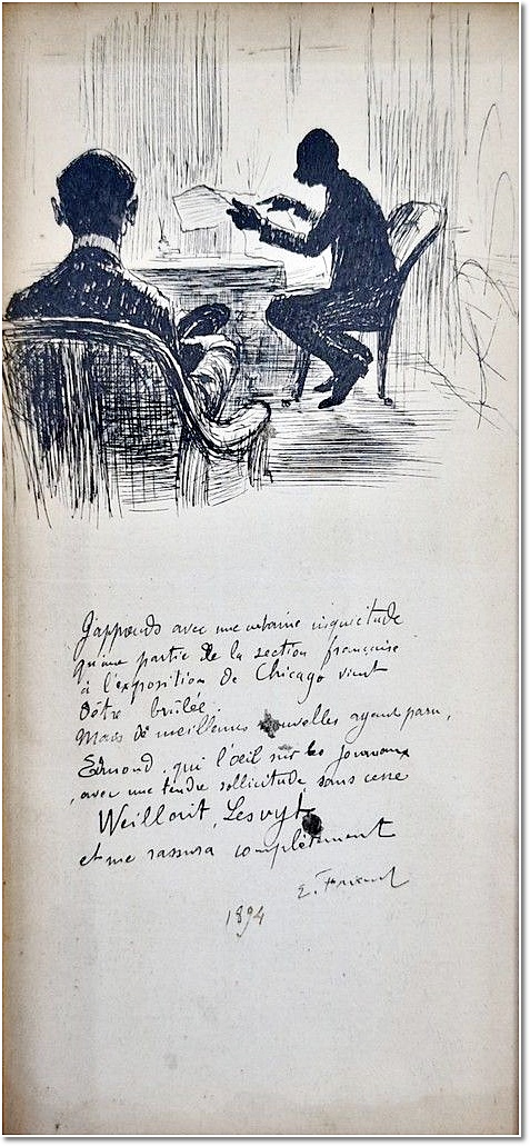 Croquis et texte à propos de l'incendie de l'Exposition Universelle de 1893 à Chicago