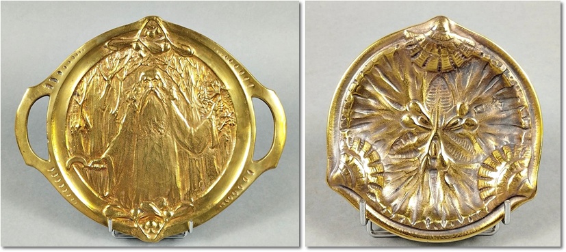 Jules CAYETTE (1882-1953). Plateau Art nouveau "Au gui l'an neuf", en bronze, à l'effigie d'un druide coupant du gui à l'aide d'une faucille. Signé. 31 x 26 cm. Etienne Martin, spécialiste de Jules Cayette, date ce plateau des années 1906-1909, avant l'installation de l'artiste à son compte. Cette oeuvre, précoce, illustre la qualité de sculpteur-modeleur de Cayette qui remporta le premier prix du concours de 'Ecole de Nancy de 1906, pour une jardinière. 500€ Nancy le 21/10/25