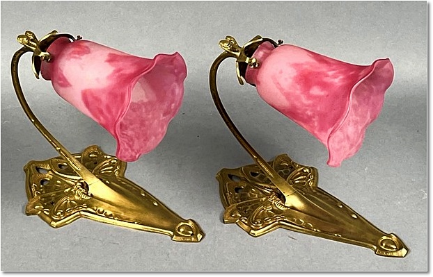 Paire d'appliques en bronze moulé et ciselé, à décor de papillons, retenant chacune une tulipe en verre marmoréen rose, signée. H. base des appliques: 26,7 cm.; H. tulipe: 14,5 cm. Ces appliques, dont le modèle est rare, sont complètes de leurs griffes d'origine, au dessin propre à Jules Cayette. La forme générale de l'applique et la nervosité de la ligne qui n'est pas sans rappeler le fameux miroir Péquart aux lézards, permettent de dater le modèle des années 1910. 2000€ Nancy le 20/11/2025 €