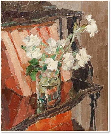 Victor GUILLAUME (1880 - 1942). "Bouquet de roses blanches sur étagère". Huile sur toile. Signée en bas à droite. Dimensions: 46 x 38 cm.
