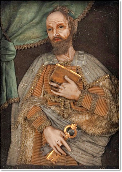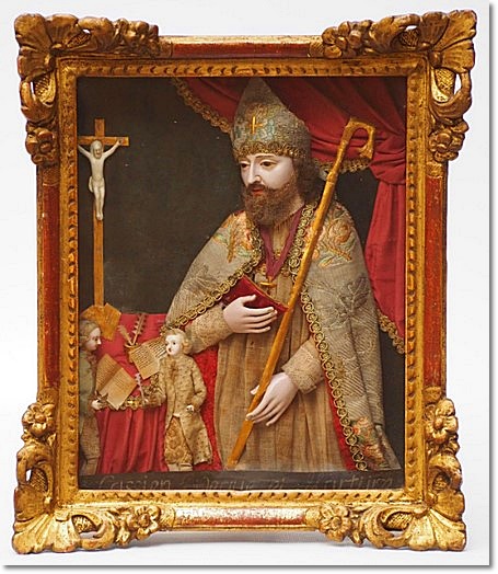 Rare cire "habillée" représentant Saint Cassien d'Imola, avec deux
