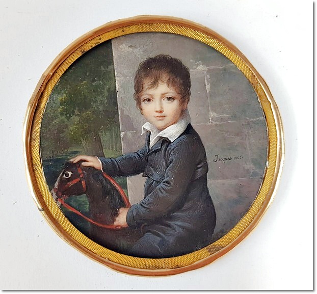 Nicolas JACQUES (Jarville, 1780 - Paris, 1844) - Portrait d'enfant au cheval de bois - Miniature ronde sur ivoire signée en bas à droite et datée 1805 - Poids brut : 12,8 g - D. 7 cm - ( sans cadre et cerclage à restaurer) - 2150€ Nîmes le 15/11/2025