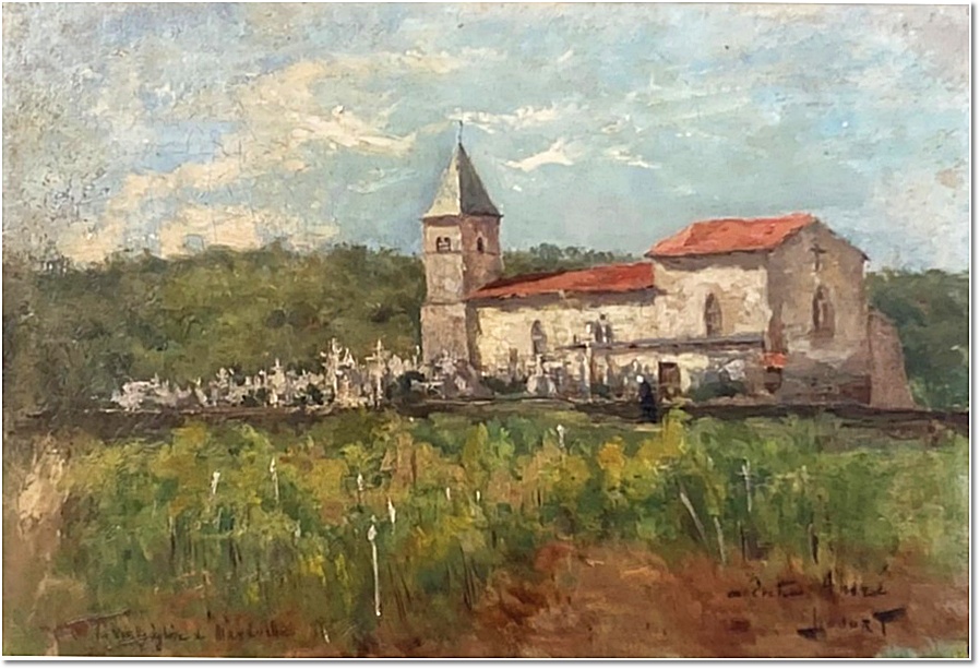 Vieille église de Mareville. Huile sur panneau, signé en bas à droite,