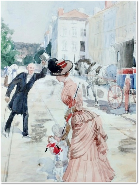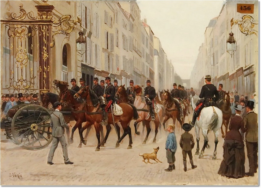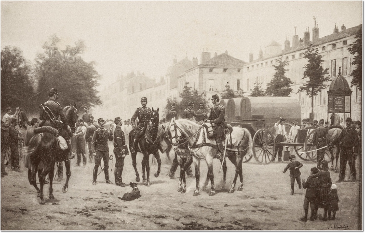 Promenade à cheval / Out for a ride, par Jules-Antoine Voirin. Petite toile de 21x26 cm représentant le café de la Monnaie et sa terrasse au coin de la rue de la Monnaie et de la place de l’Académie (Carnot). « La petite Provence » ( lieu entre la brasserie "la Viennoise" et le renfoncement où était édifié le bastion de Salm), un jour de grand soleil. Le café sera démoli le 12 Février 1918 lors d'un bombardement.