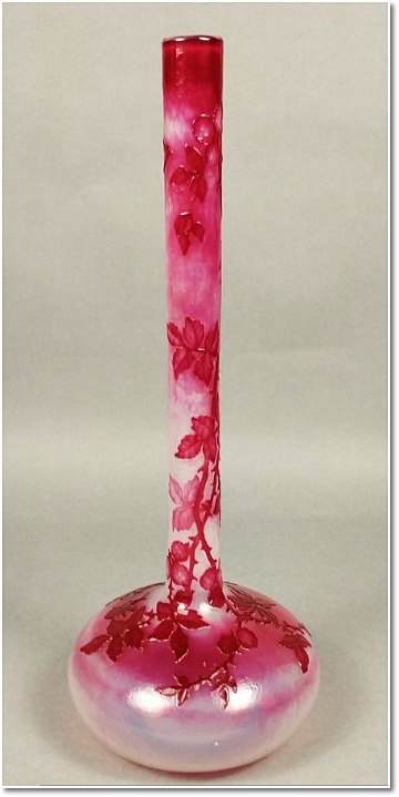 Charles VESSIERE (1866-1941) à Nancy (Lorraine). Grand vase à long col tubulaire en verre double couche gravé à l'acide, à décor repris à la roue de roncier et de mûres. Signé. Début du XXe siècle. 850€ Nancy le 31/10/25 Haut. 44 cm.