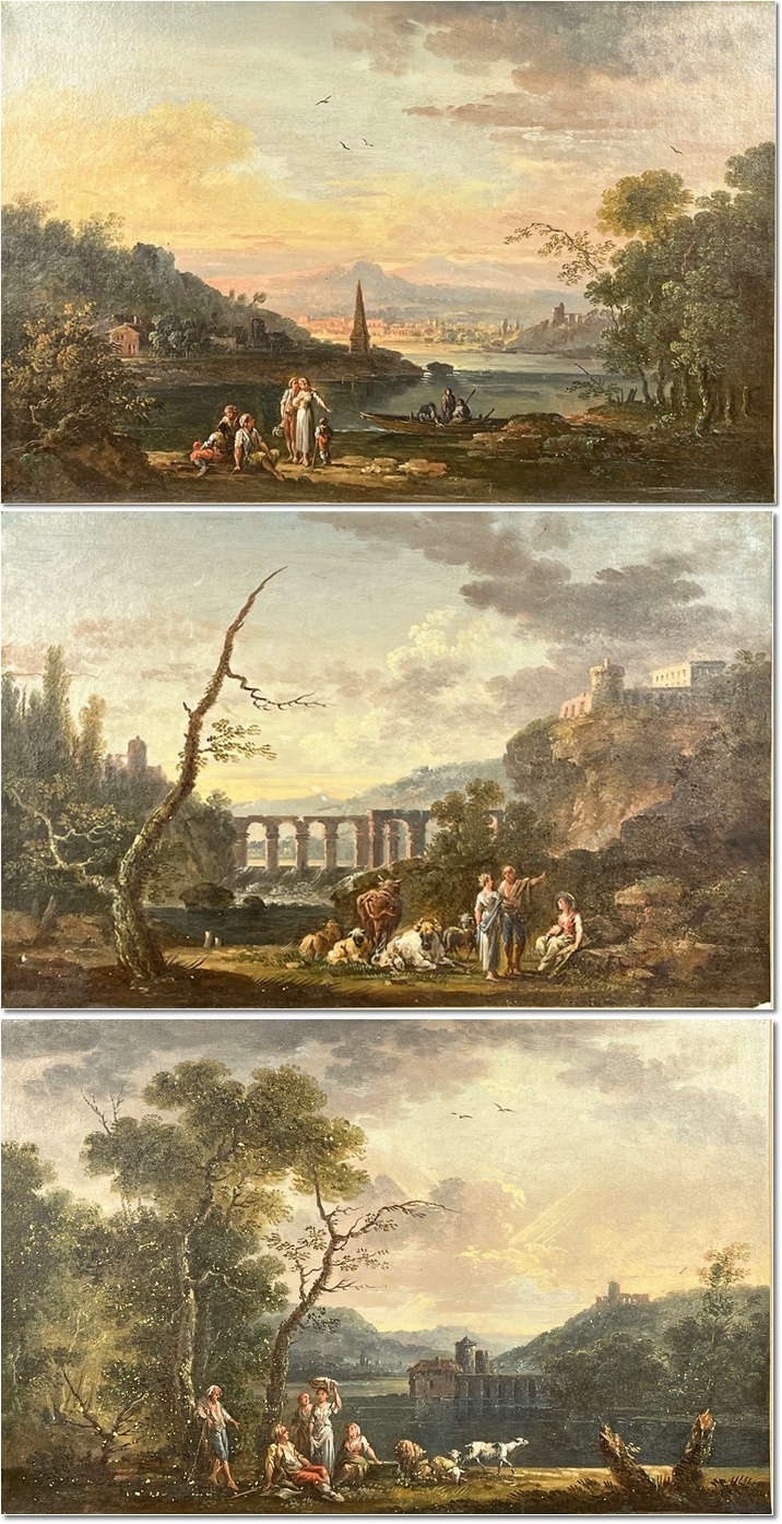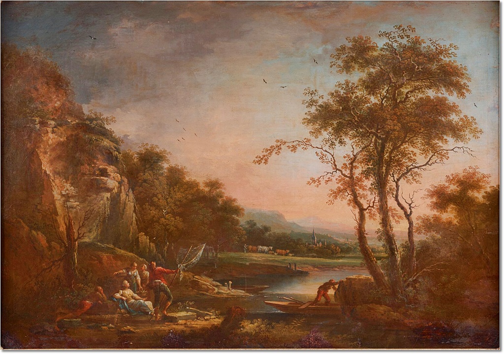 Le présent tableau accompagne probablement le Paysage avec figures au bord d'une rivière, également attribué à Jean-Baptiste Claudot de Nancy. Les deux tableaux ont une échelle, une palette et un équilibre compositionnel comparables, ce qui suggère qu'ils ont été conçus comme une paire de pendants pour un intérieur aristocratique.