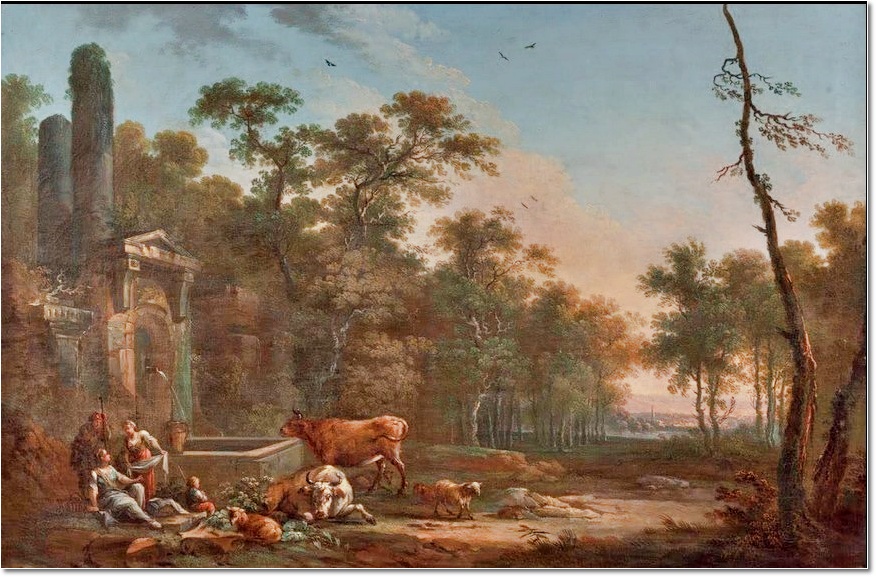 CLAUDOT Jean - Baptiste dit Claudot de Nancy. Badonviller 1733 - Nancy 1805. Pâtre et villageoises, et leurs animaux à la fontaine. Huile sur toile. H. 65 - L. 90 cm. Provenance : Versailles, Palais des Congrès, Etude Martin, 5 décembre 1976, n° 26 (reproduit).
