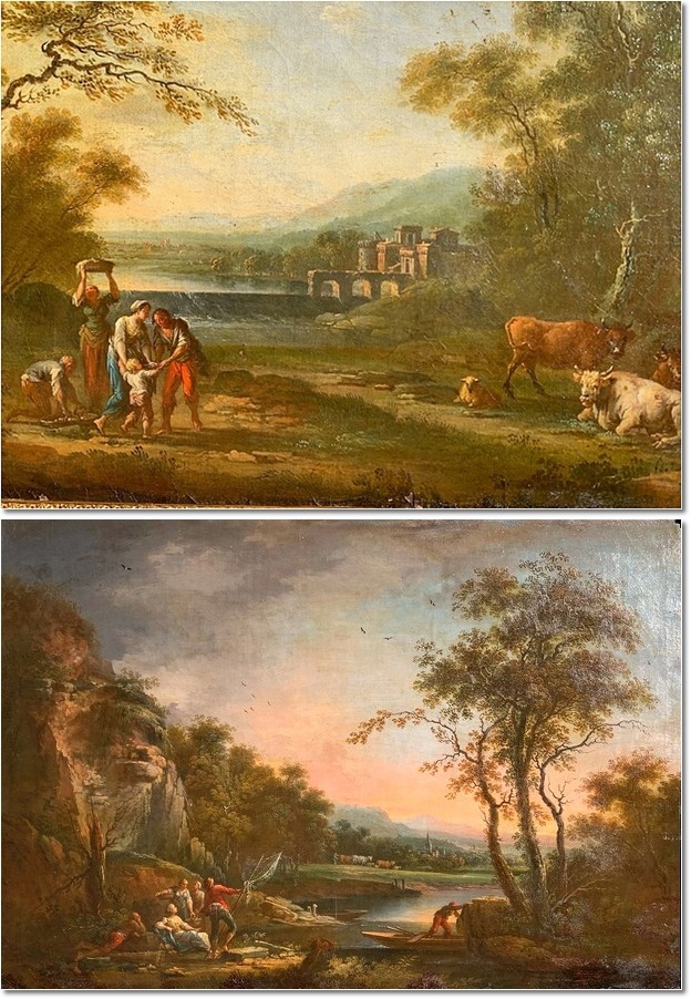 Jean-Baptiste CLAUDOT, dit CLAUDOT DE NANCY (1733-1805) Paysages animés de personnages. Deux huiles sur toile pouvant former paire. Dimensions : 71,5 x 99 cm Dimensions avec le cadre : 81 x 108 cm Nice le 29/08/25 non adjugé 3000€