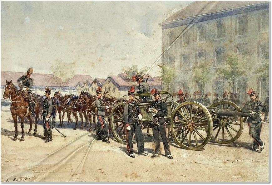 "Artillerie à cheval se préparant pour une revue. Probablement 8ème artillerie de Nancy"